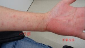 第2期(感染後数か月): 全身に淡い赤い発疹(バラ疹)や、手のひら・足の裏に盛り上がった発疹(丘疹)が出る。